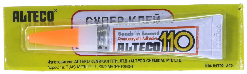 Многофункциональный суперклей «Alteco 110» обладает отличными адгезионными характеристиками (сцеплением материалов). Поэтому средство можно применять для различных поверхностей – пластик, фарфор, металл, дерево, кожа и другие. Быстрота использования и высокое качество продукта обеспечивают превосходное склеивание за несколько секунд.