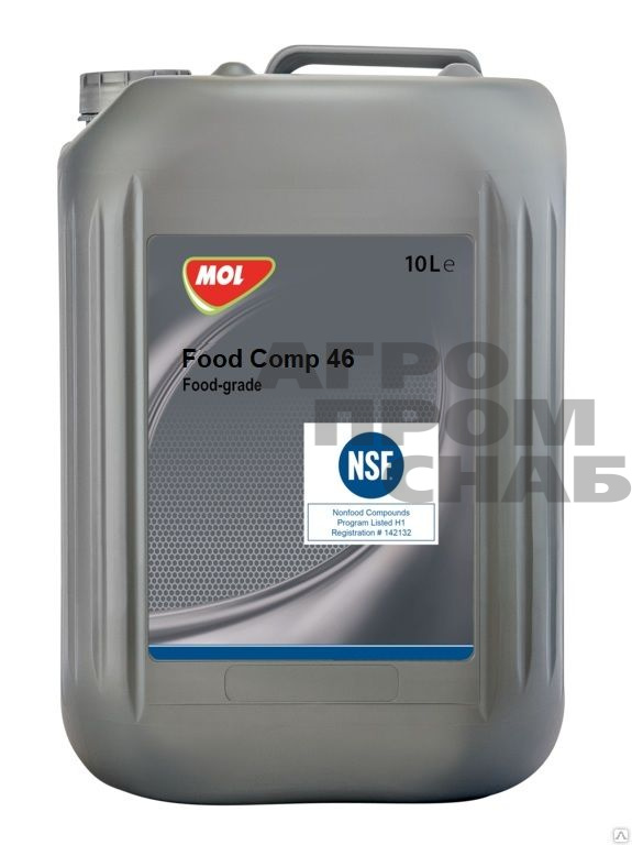 Синтетическое компрессорное масло MOL Food Comp 46 изготавливается на основе полиальфаолефинового (ПАО) базового масла и тщательно подобранных присадок; особенно подходит для воздушных компрессоров, применяемых в составе производственного и погрузочно-разгрузочного оборудования для пищевой промышленности. Является продуктом категории Н1, зарегистрированным NSF: «Данный продукт может использоваться как смазочный материал, имеющий пищевой допуск (Н1) в среде прямого и косвенного воздействия на обработку продуктов, где есть вероятность случайного контакта с пищей». По сравнению с обычными компрессорными маслами на минеральной основе имеет более широкий температурный диапазон применения и улучшенную стойкость к окислению. Для обеспечения наилучших смазывающих характеристик и во избежание риска токсического воздействия рекомендуются укороченные интервалы замены после первой заправки, особенно если ранее оборудование эксплуатировалось на обычном компрессорном масле. Рекомендованные интервалы замены: - 3000 часов при температуре сжатия <85 °C; - 1500 часов при температуре сжатия >85 °C (макс. 100 °C).