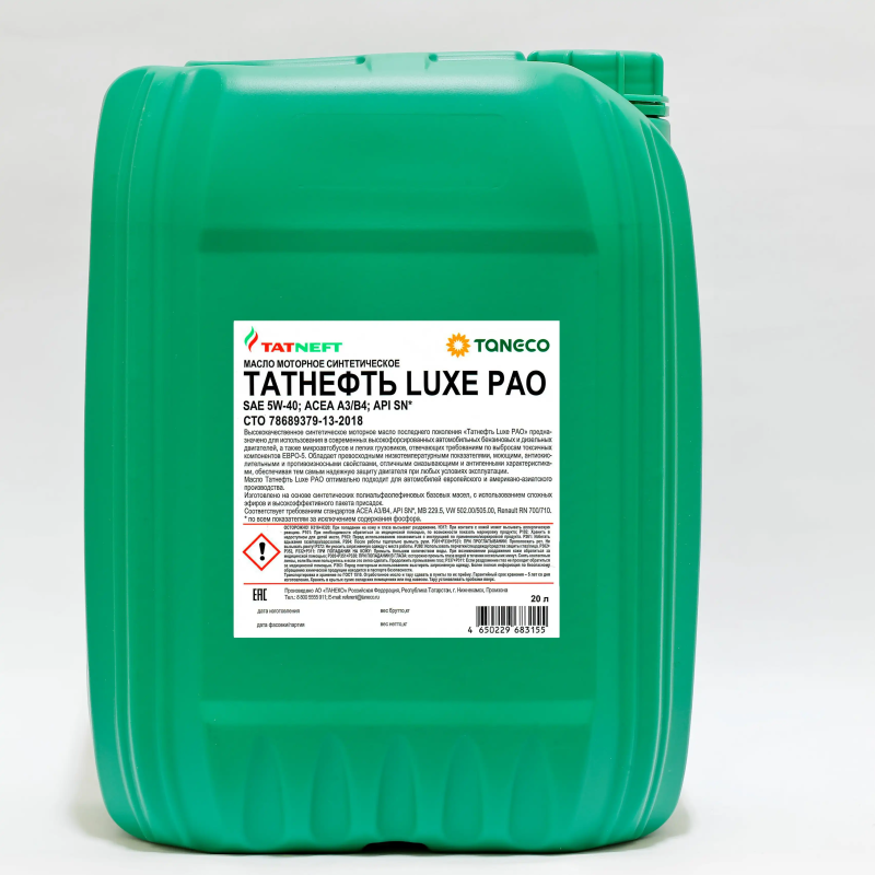 Синтетическое моторное масло «Татнефть LUXE PАO», изготовленное на основе полиальфаолефинов и эстеров с использованием многофункционального пакета присадок, предназначено для использования в высокофорсированных бензиновых и дизельных двигателях легковых автомобилей, микроавтобусов и легковых грузовиков без сажевых фильтров, отвечающих требованиям по выбросам токсичных компонентов Евро-5.
