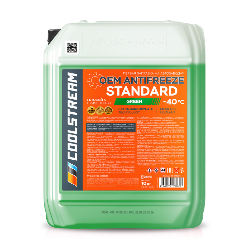 Coolstream Standard — 100% карбоксилатный антифриз (OAT), используемый для заправки в новые автомобили на заводах ГАЗ, КАМАЗ и др. Имеет официальный допуск АвтоВАЗ, прописан как рекомендованный антифриз в Руководстве по эксплуатации